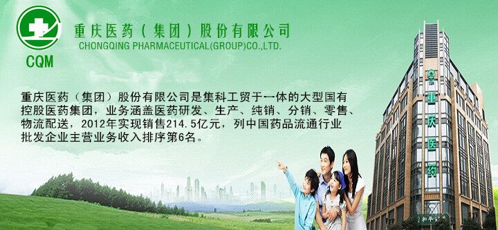 • 重庆医药(集团)股份有限公司是重庆市国资委重点骨干子企业,是重庆化医控股(集团)公司的控股子公司。公司前身为1950年成立的中国医药公司西南区公司,1994年改制为股份制企业。2012年3月,通过整合资源,实现科、工、贸一体化格局。截至目前,拥有分、子公司30个,地跨渝、川、贵、赣、鄂、湘、冀等地,员工近13000人(其中专业技术人员3650名)。2014年公司实现销售298亿元,连续多年名列中国医药商业第六位。始终名列重庆药交所配送会员交易额前茅。