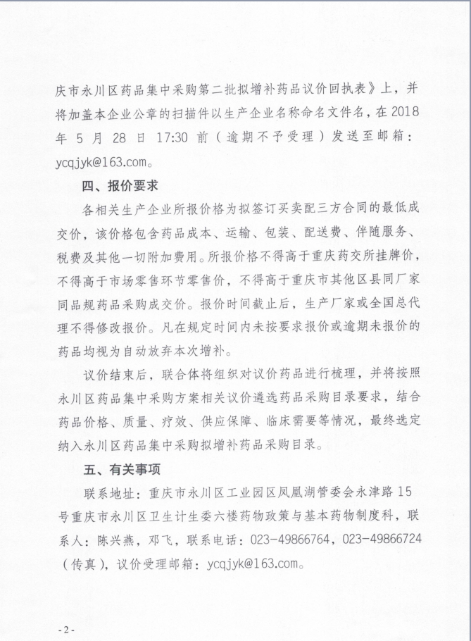 附件2:重庆市永川区药品集中采购第二批拟增补药品议价回执表